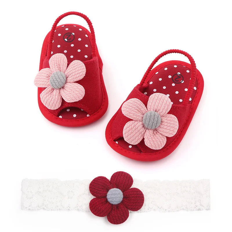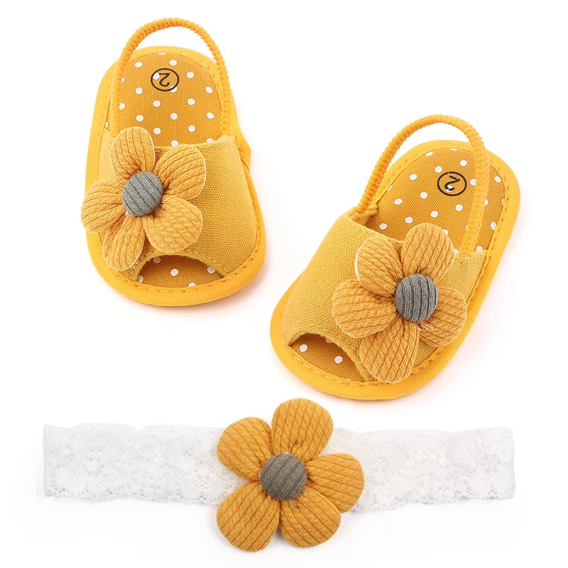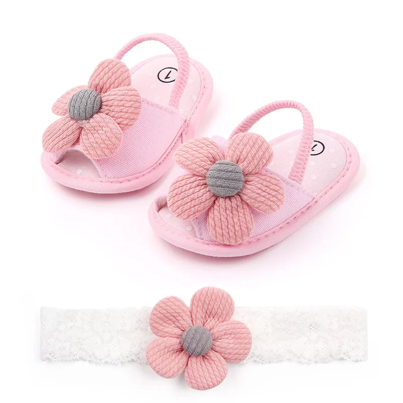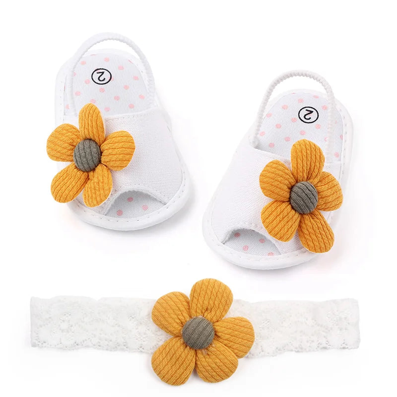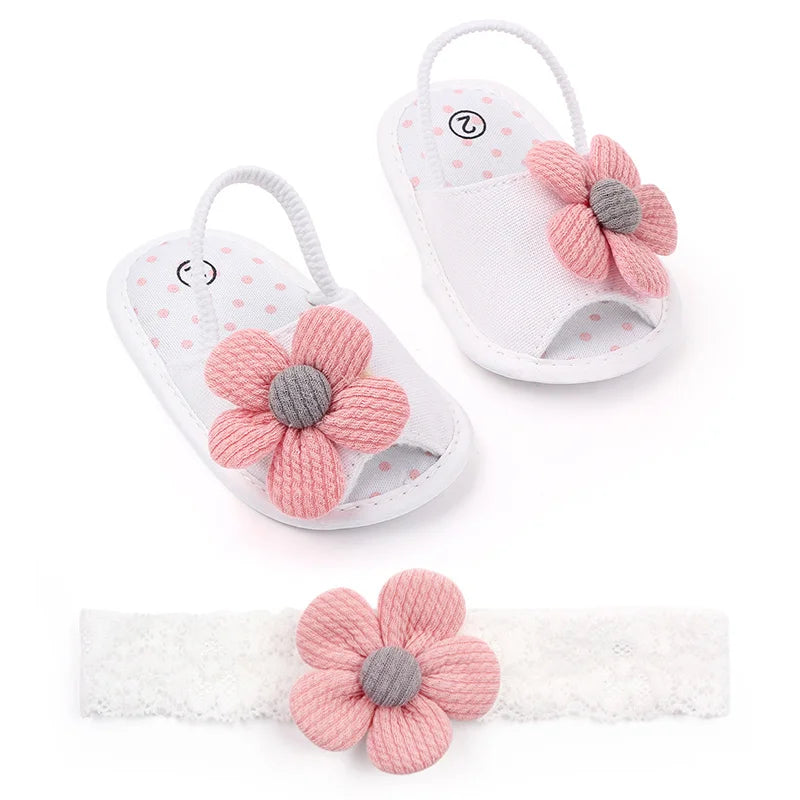 Deixe sua pequena ainda mais encantadora com esse conjunto delicado de sandália e faixa de cabelo, feito em algodão macio e respirável, perfeito para os dias de primavera e verão.
