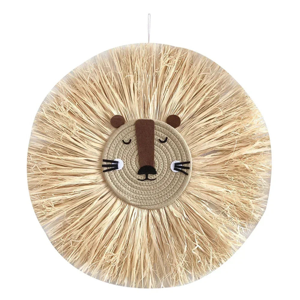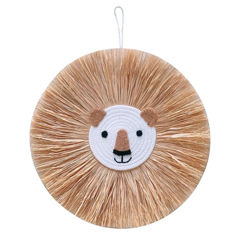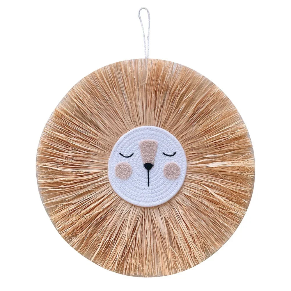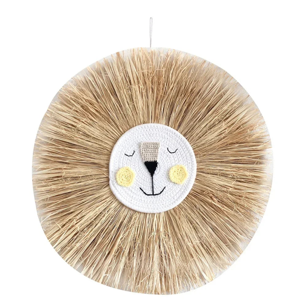 Encante o quarto do seu bebê com esta arte de parede artesanal, feita à mão com fio de algodão, ráfia e palha natural.