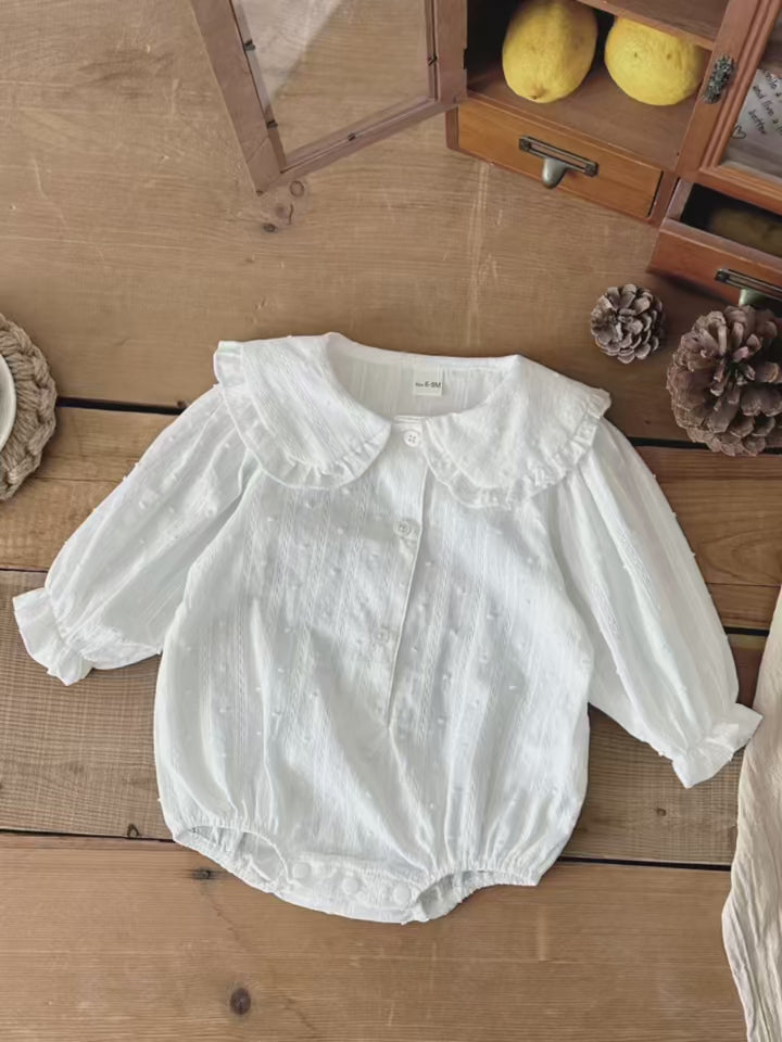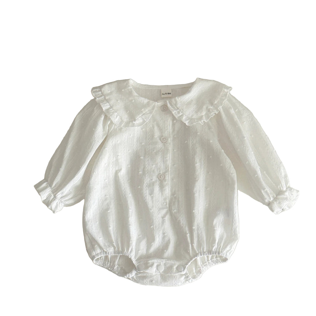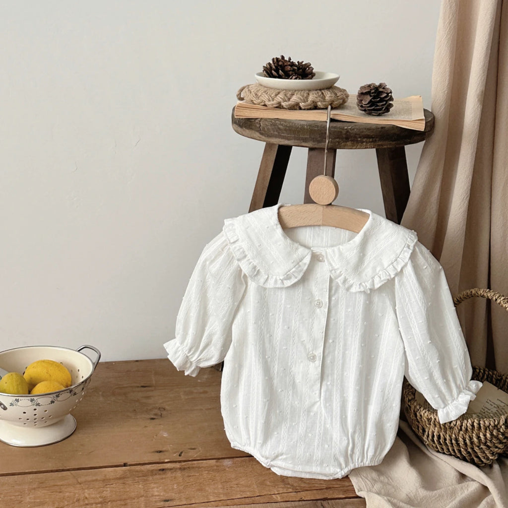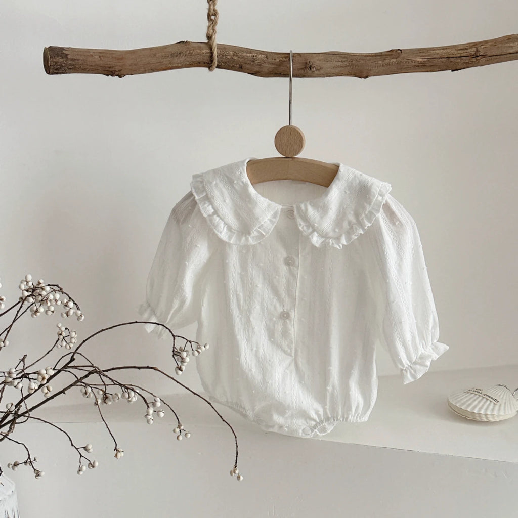 Deixe a hora de vestir da sua pequena ainda mais encantadora com este body branco com detalhes de babadinhos na gola Peter Pan.