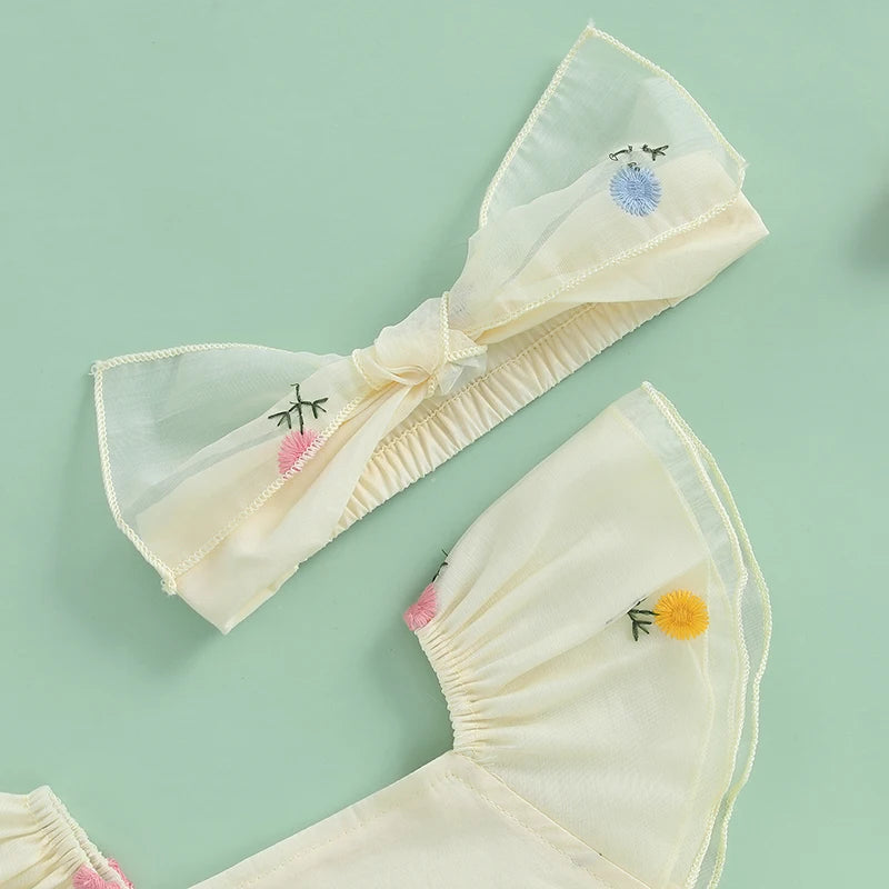 Deixe sua bebê ainda mais encantadora com este macacão de verão bordado com flores, feito em algodão macio e poliéster leve, perfeito para os dias quentes.