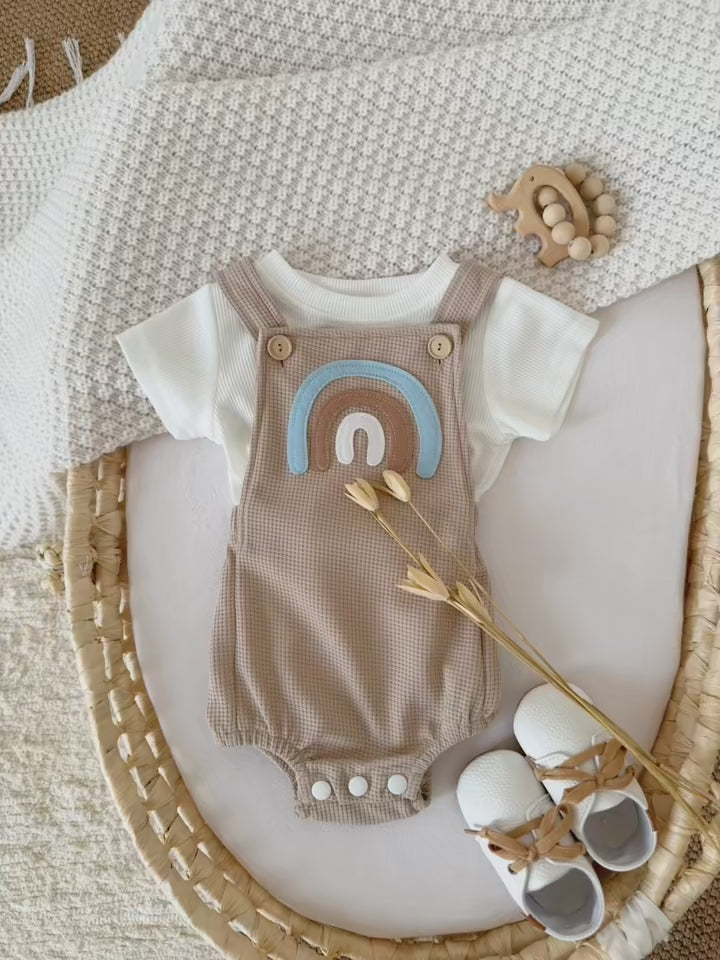 Deixe seu bebê pronto para os dias quentes com este conjunto, que combina o macacão curto trançado com estampa de arco-íris e uma t-shirt branca básica, perfeita para complementar o look com praticidade e estilo. 💛