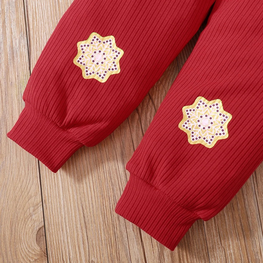 Praticidade Total: O body é tipo Pulôver com Gola O-Neck, e o conjunto inclui a calça vermelha, oferecendo duas peças fáceis de vestir.