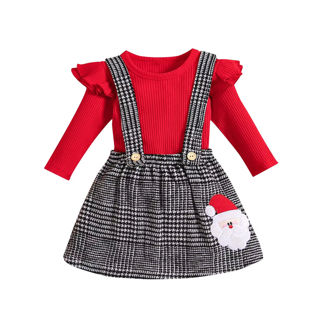 Composto por um macacão de malha canelada em cor sólida e uma saia suspensória em pied-de-poule com bordado de Papai Noel, este look combina charme clássico com o toque festivo que a data pede.