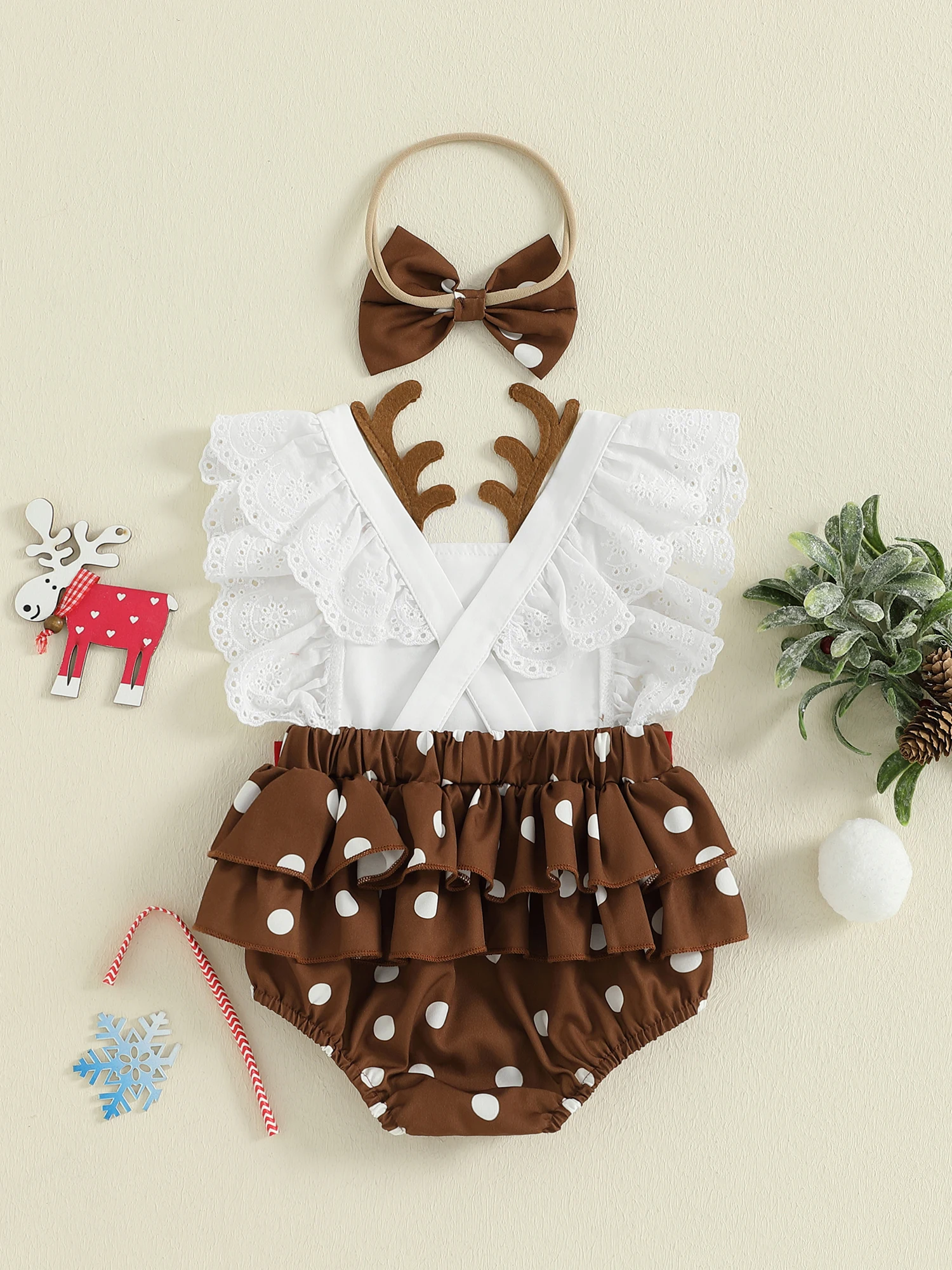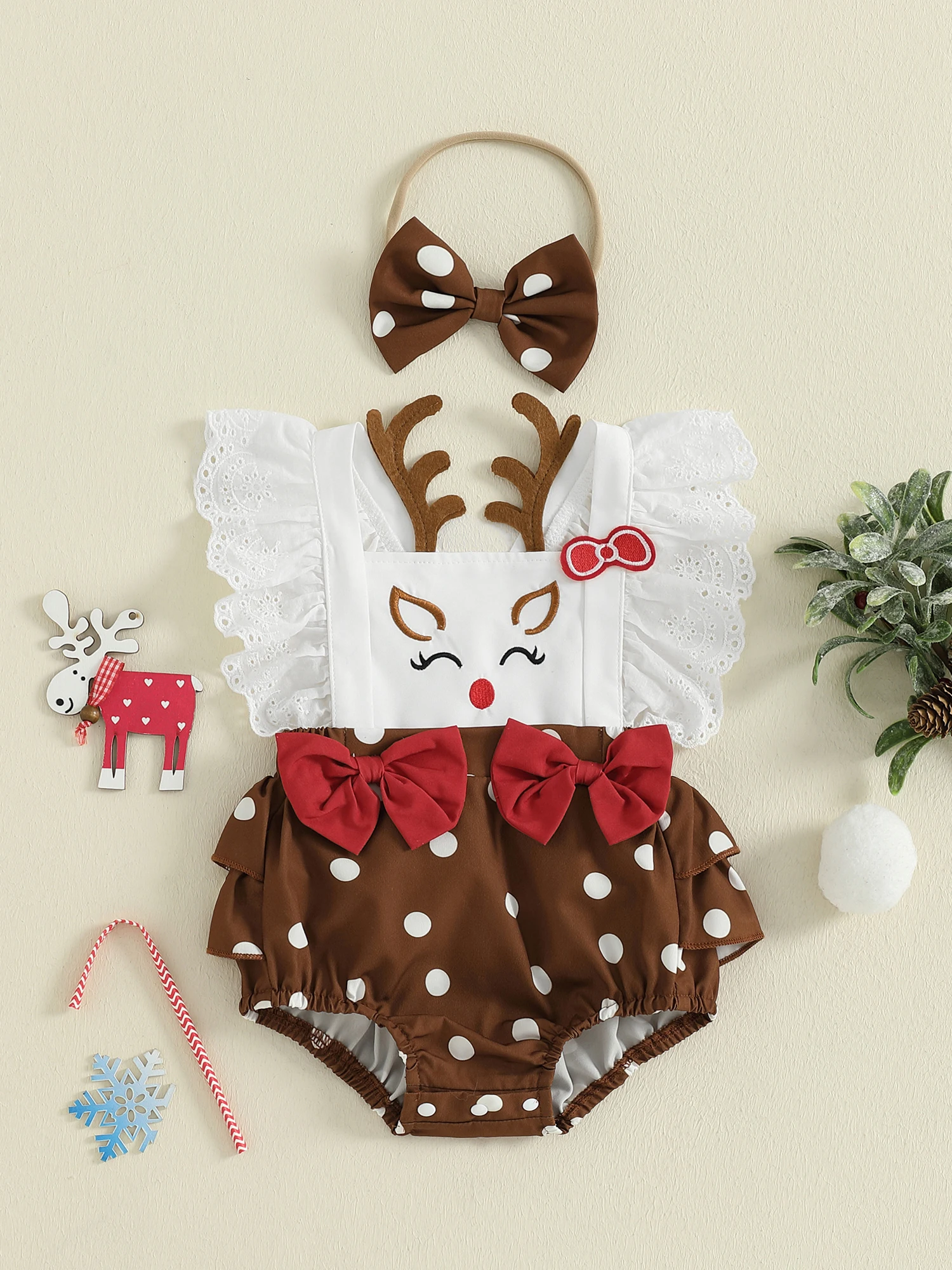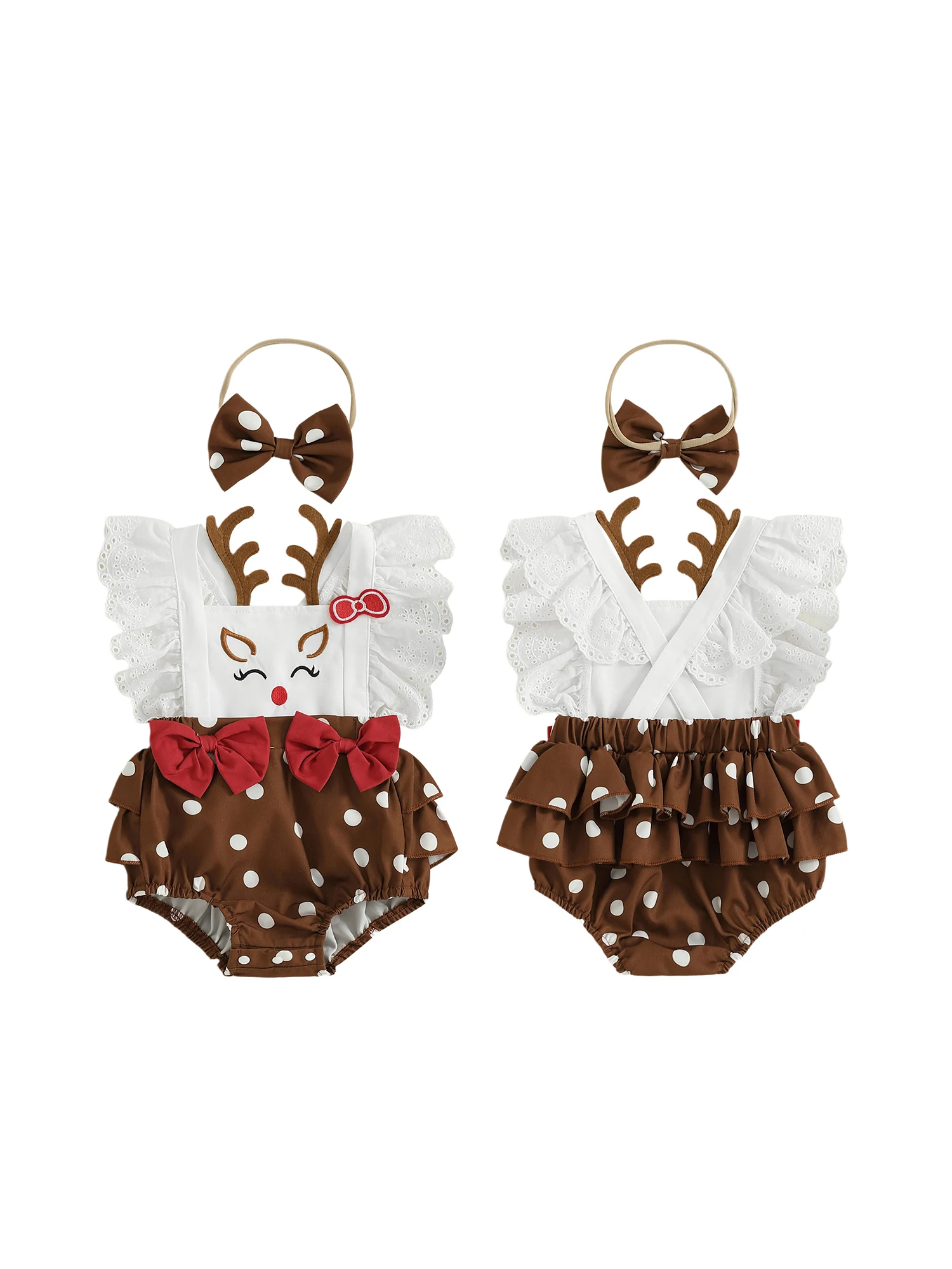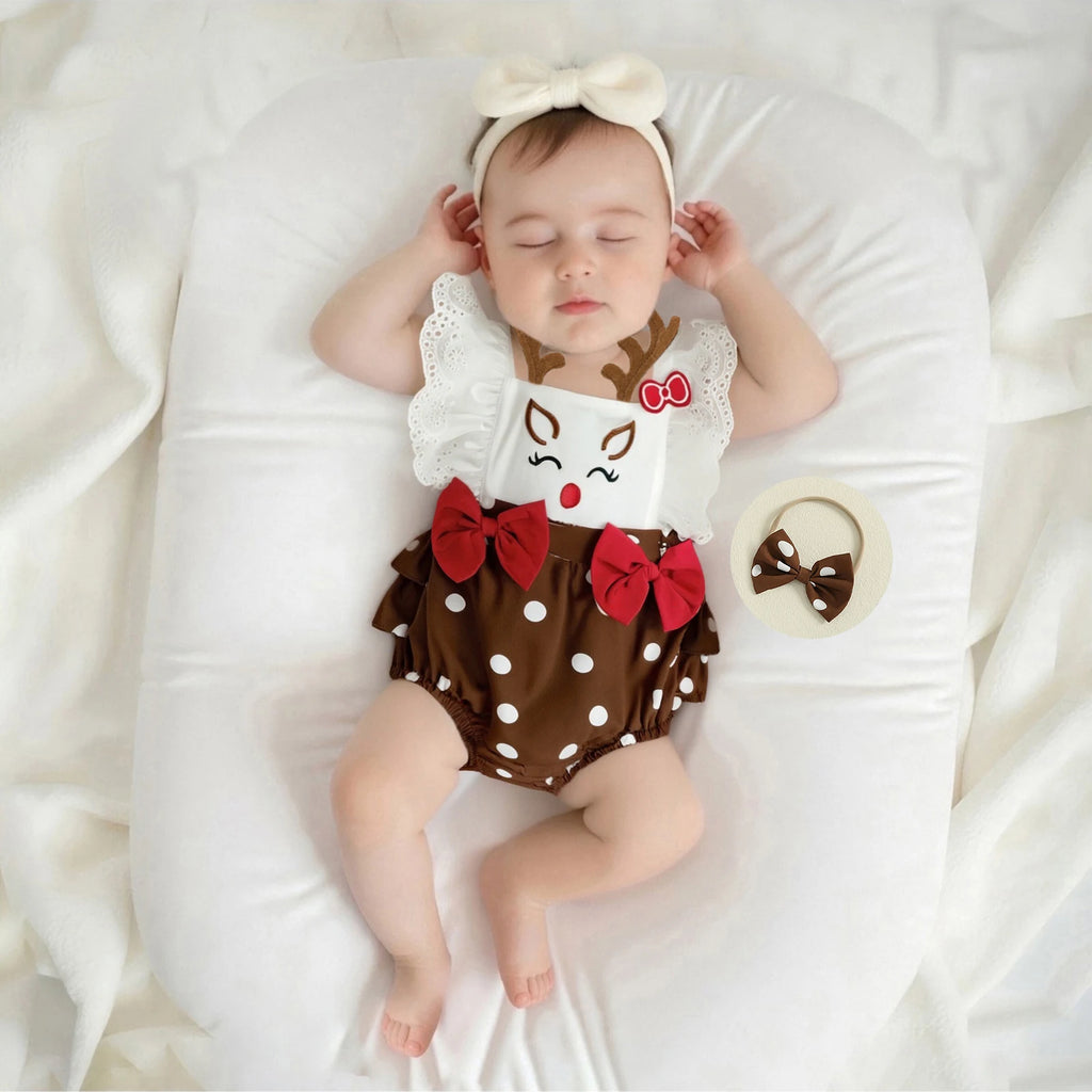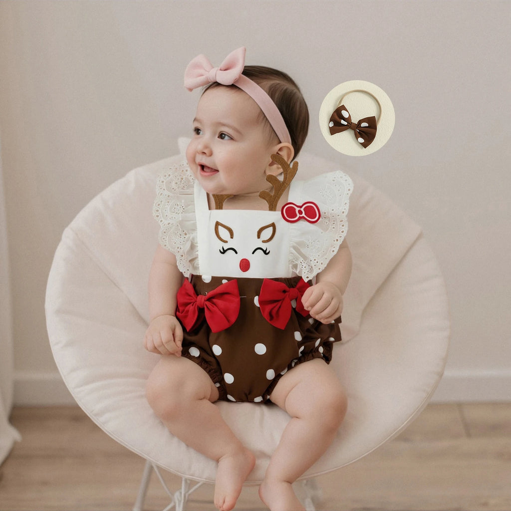 Encante-se com este conjunto de 2 peças para bebê menina, composto por um macacão fofíssimo com estampa de rena e uma faixa de cabeça com laço — o look perfeito para fotos encantadoras, festas ou momentos especiais em família.