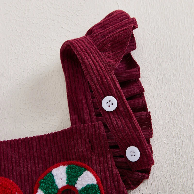 Encante-se com este romper de veludo cotelê bordado com bengala de doce, acompanhado de uma faixa de cabeça super charmosa, perfeito para o primeiro Natal da sua pequena!