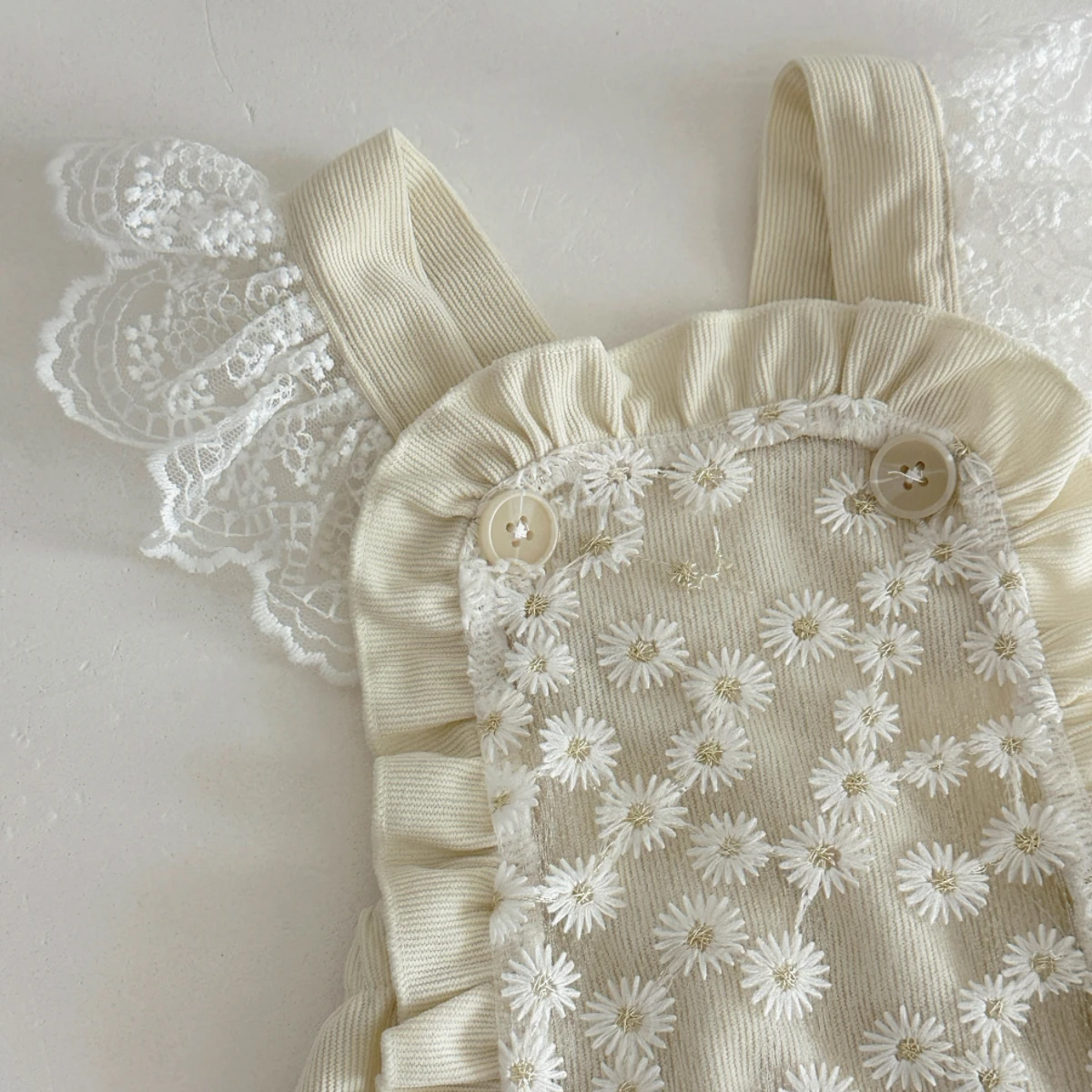 O destaque fica por conta dos detalhes em renda com desenhos de flor em bordado, que trazem um toque romântico e sofisticado ao visual — delicado na medida certa para momentos especiais ou passeios ao ar livre.