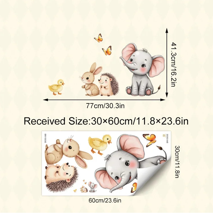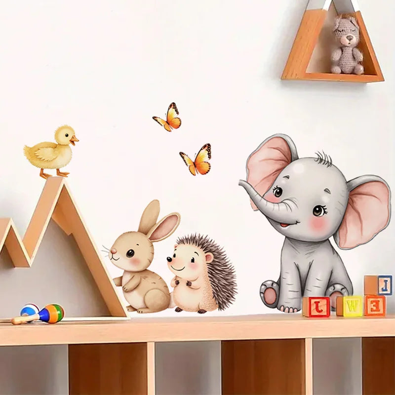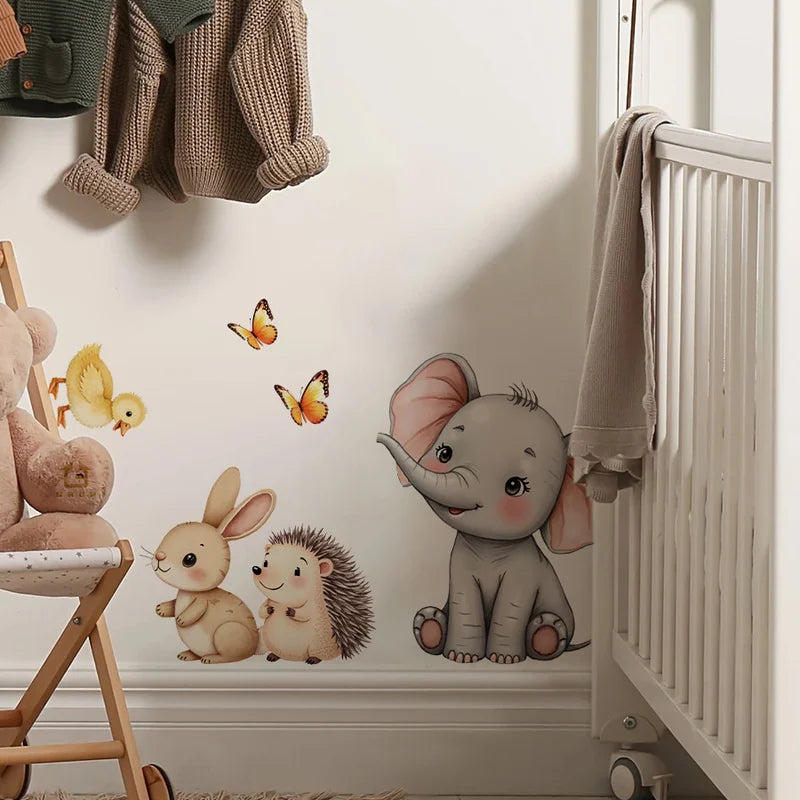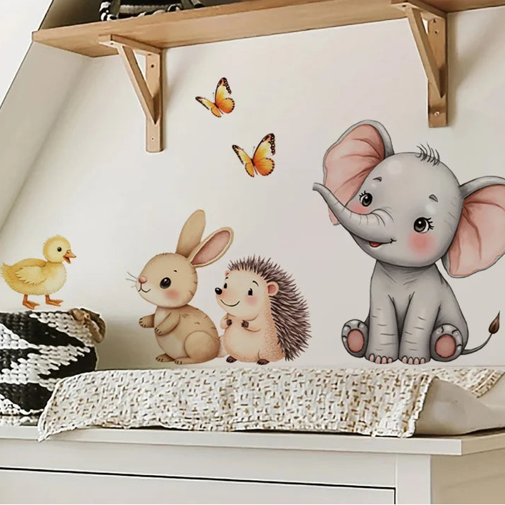 Com elefantes, coelhinhos e ouriços encantadores, esta arte adesiva traz leveza e alegria para berçários, quartos infantis ou salas de brincar.