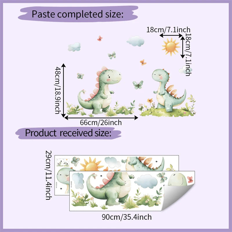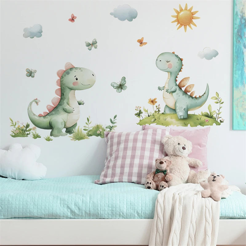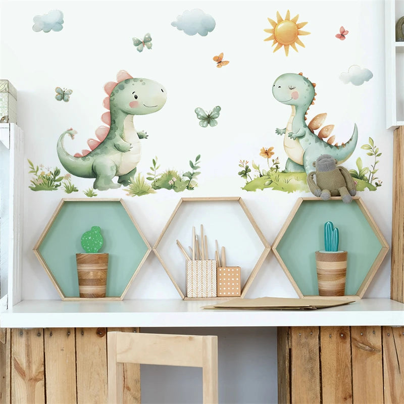 Transforme o quarto das crianças em um mundo de aventuras pré-históricas com este conjunto encantador de 2 peças de adesivos de parede de dinossauros de desenho animado!
