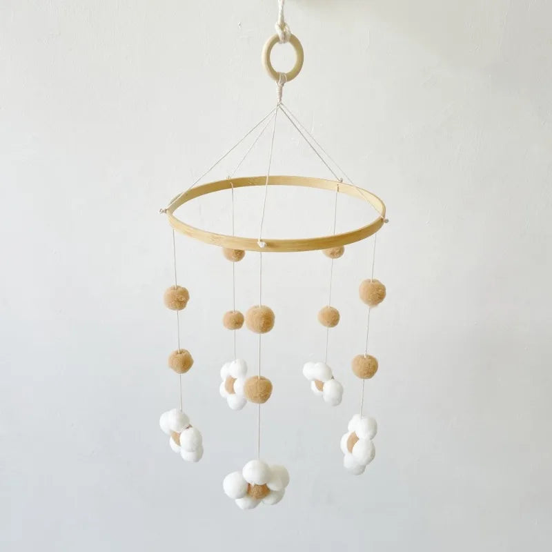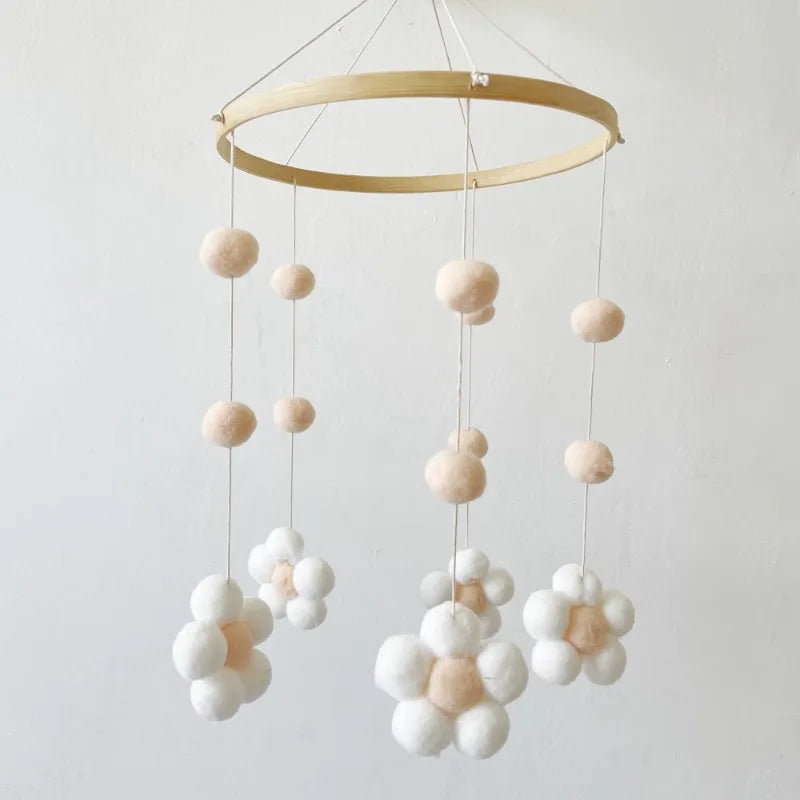 Encante-se com o toque suave e poético do mobile estilo nórdico com flores e bolinhas de pelúcia.