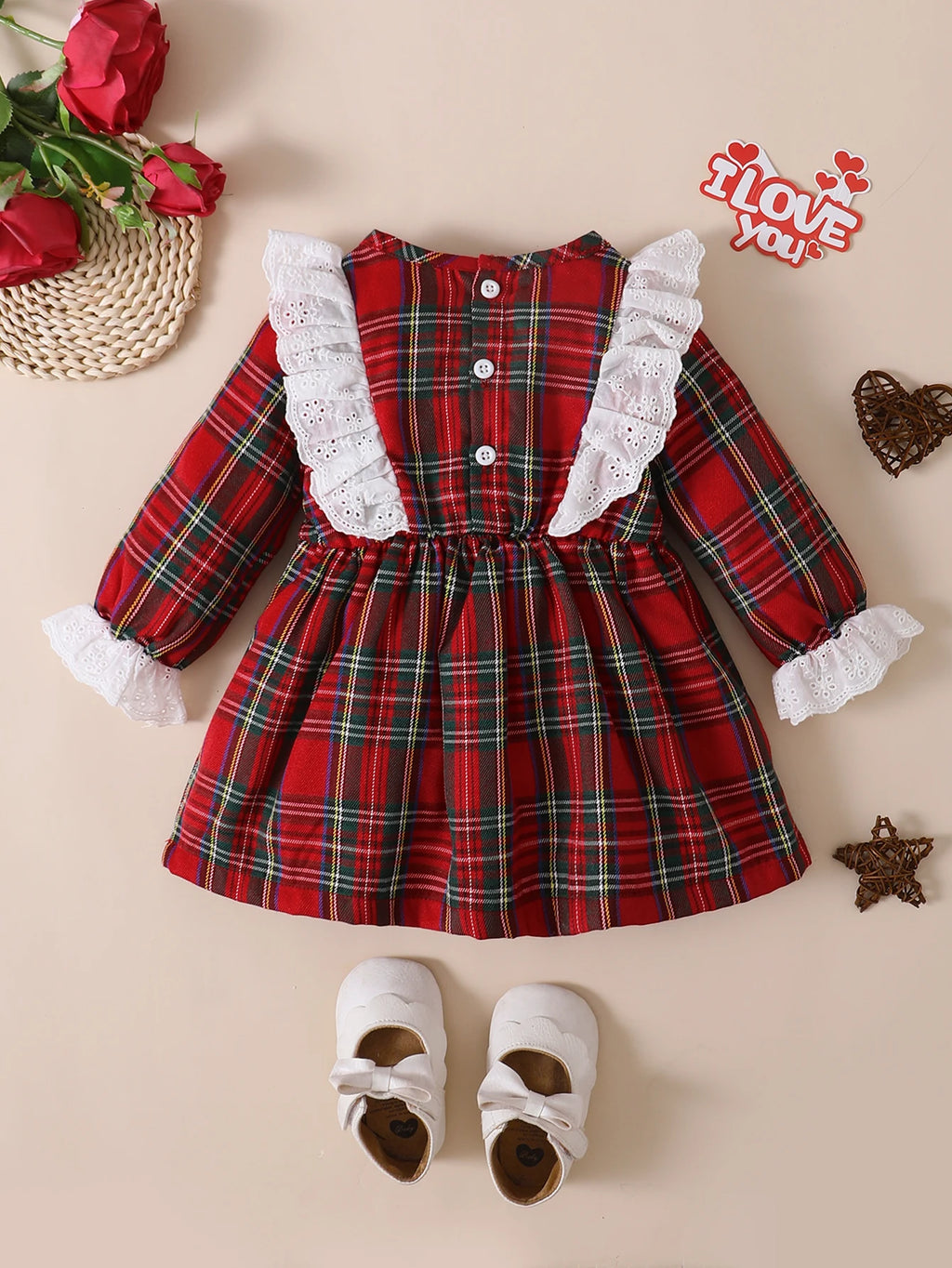 Seu bebê vai brilhar com este vestido xadrez vermelho com babados, perfeito para os dias de primavera e outono.
